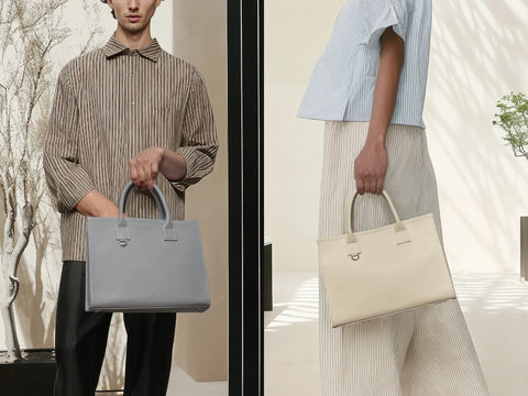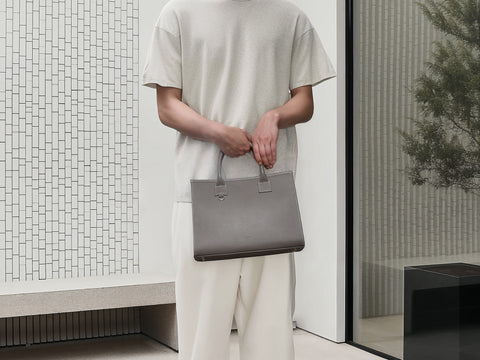 横長スクエアと極細マチの絶妙バランス。スーツに合わせればシャープさを、カジュアルに合わせればこなれ感を演出します。ミニマルな面構成にロゴを一点だけ配置した“引き算の美学”が、大人の余裕を語ります。