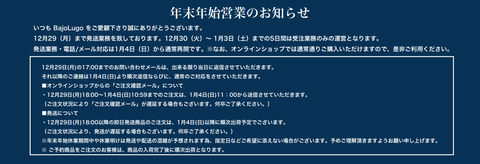 対象条件: 全てのお客様。予約商品以外の全商品。福袋も含む。 利用期間:2025.12.30 (火) 20:30 - 2026.1.5 (月) 15:00まで クーポンコード:15odc2601 |